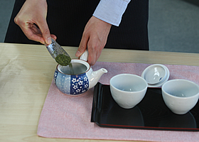 1. お湯で急須と茶碗を温め、いったんお湯を捨てます。急須に入れる茶葉はティースプーン山盛り三杯分です。